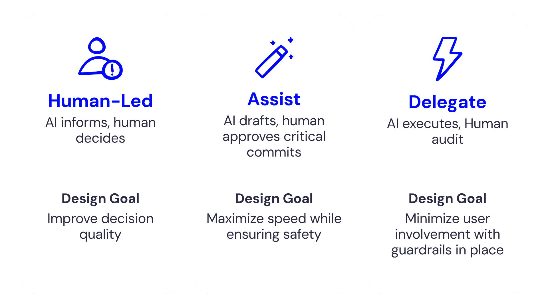 Gate with Metrics: Monitor how often users "undo" or "edit" AI suggestions to move tasks from Assist to Delegate over time.
